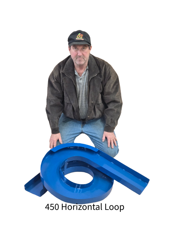 450 horizontal loop measures 23 inches wide and 31 inches long built of metal and powder coated , blue is stock color other colors available upon request.